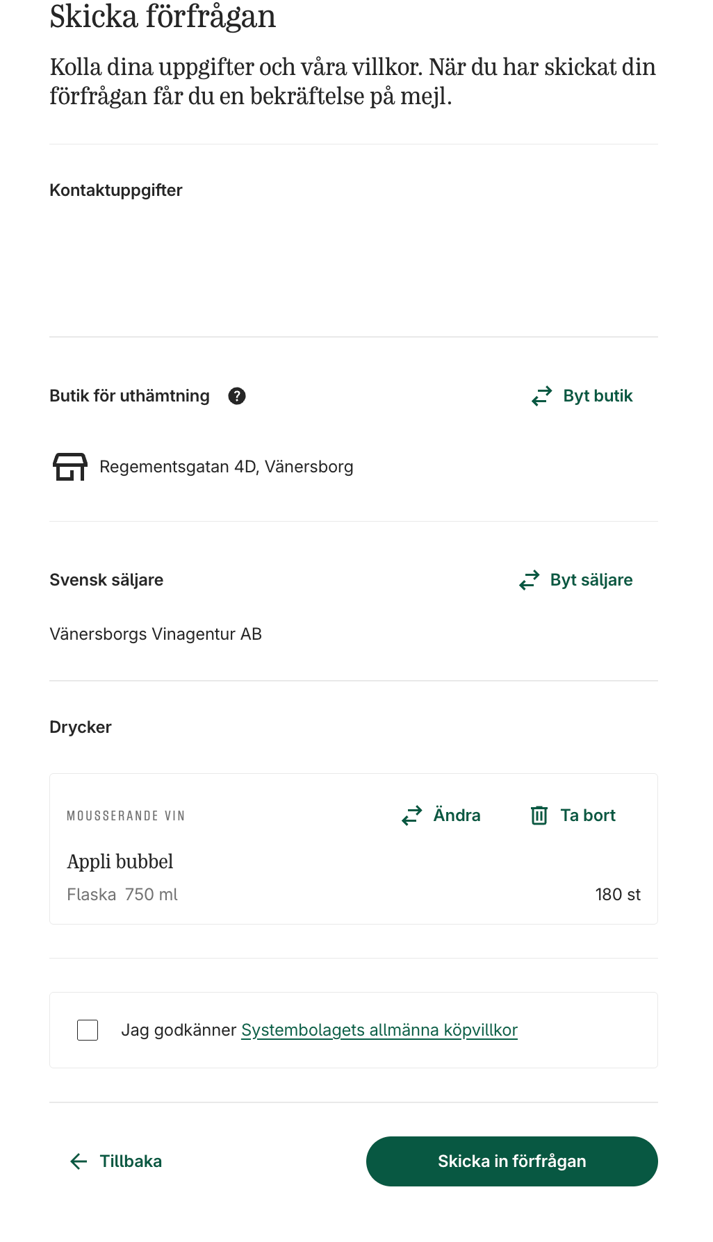 All vår hantering av vin, förutom den som sker mot restauranger, måste ske via Systembolaget. Vi har inte tillstånd att sköta denna hantering åt slutkunden utan beställning samt uthämtande av vinet måste göras av kunden själv. När vi hanterar vin med specialetiketter så måste vinet hanteras genom en tjänst hos Systembolaget som kallas Privatimport.